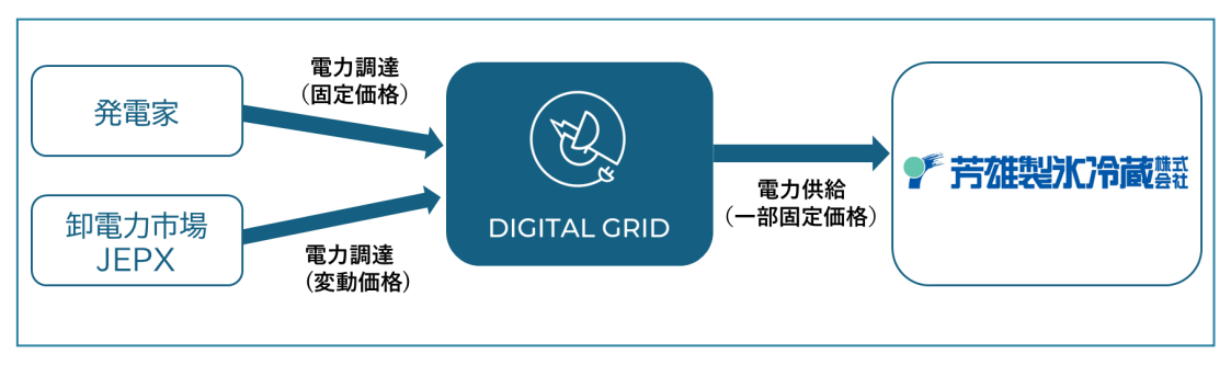 デジタルグリッド株式会社(本社:東京都港区、代表取締役社長CEO:豊田祐介、以下「当社」)は、福岡県冷蔵倉庫協会所属の芳雄製氷冷蔵株式会社(本社:福岡県飯塚市、代表取締役社長:小金丸泰斗、以下「芳雄製氷冷蔵」)の冷蔵倉庫について、一部の電力を固定価格で調達する取り組みを支援しました。