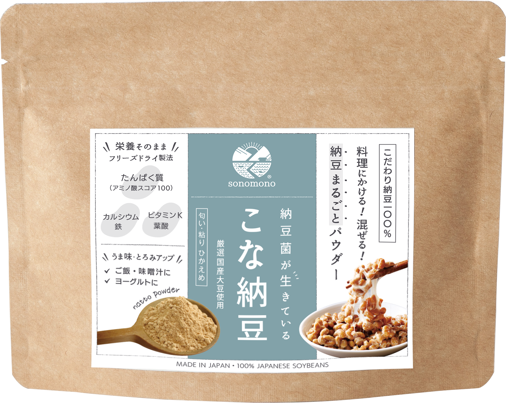 日本の良いものをsonomonoブランドを通して世界の人々へ。日本が誇る伝統的発酵食品「納豆」を丸ごと活かした「こな納豆」は、2020年5月に米国にて発売を開始しました。