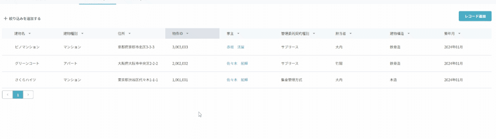 本機能により、日々の顧客対応業務支援に加え、各社のオペレーションに応じたデータベースを構築でき、売上/物件/入居者/案件などの様々なデータ管理・連携を実現します。