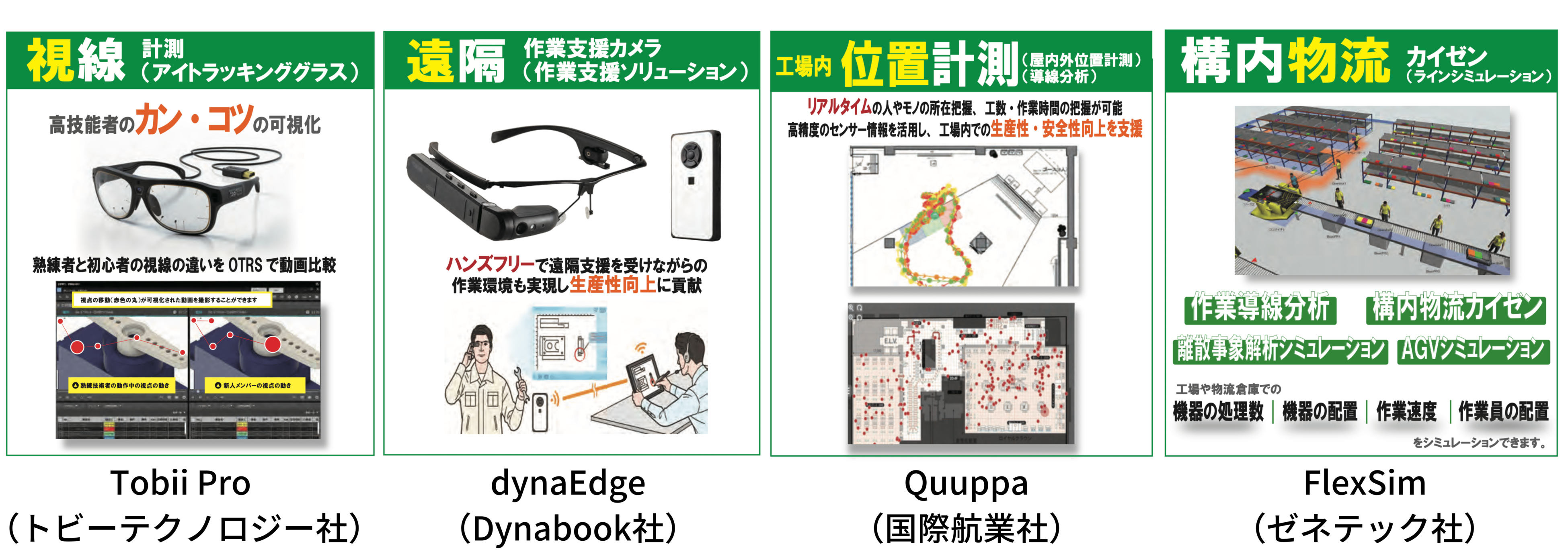 『第6回スマート工場EXPO in東京』では、「OTRS10」のほか、「OTRS10」とデータ連携が可能なアイトラッキンググラス「Tobii Pro」(トビー・テクノロジー社)やハンズフリーで作業支援が可能な遠隔支援カメラ「dynaEdge」(Dynabook社)、屋内外での位置計測が可能な位置情報管理システム「Quuppa」(国際航業社)、工場内の作業導線の分析や物流の改善を行えるシミュレーションツール「FlexSim」(ゼネテック社)を併せて展示いたします。