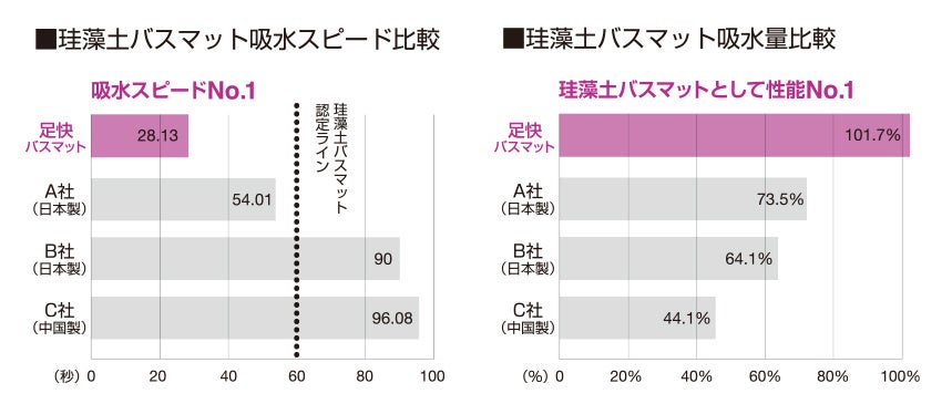 自社の検証では、海外製のものと比較すると吸水率は2倍以上を記録。また吸水の速さを測定するテストで、15ccの水を吸収するのにかかった時間は他社製品の1/2以下と圧倒的な速さでした。
