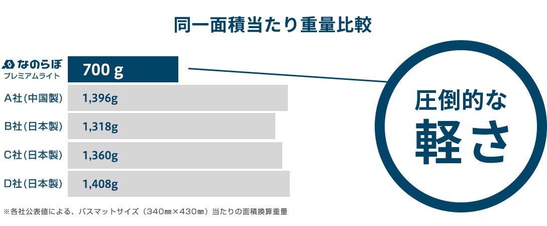 なのらぼの足快バスマットは、従来の9㎜厚品でも1000gと他社品と比較しても圧倒的な軽さですが、プレミアムライト6㎜厚品は、700gと更にズバぬけた軽さを実現しています。