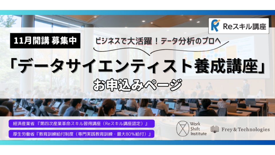 株式会社ワークシフト研究所(本社:東京都港区、代表取締役社長:小早川優子)は本日、協力会社であるフレイ・アンド・テクノロジーズ株式会社(本社:大阪府大阪市、代表取締役:高木宏明)と共同で開講する「データサイエンティスト養成講座」がこの度、経済産業省「第四次産業革命スキル習得講座(Reスキル講座)」の認定を取得したと発表しました。本認定制度は、厚生労働省の「教育訓練給付制度(専門実践教育訓練)」、「人材開発支援助成金」と連携します。これにより、「データサイエンティスト養成講座」を個人、あるいは法人で受講する場合に受講費用がそれぞれ支給・助成されます。