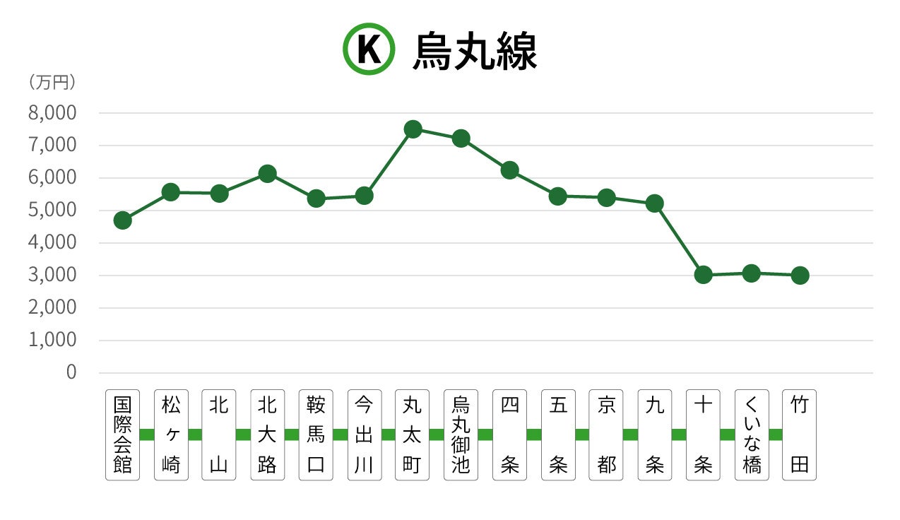 京都市内を南北に通る路線です。最も価格が高いのが丸太町駅です。一方、最も安いのが十条駅となっています。