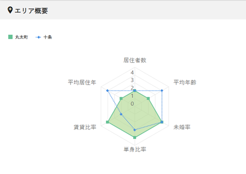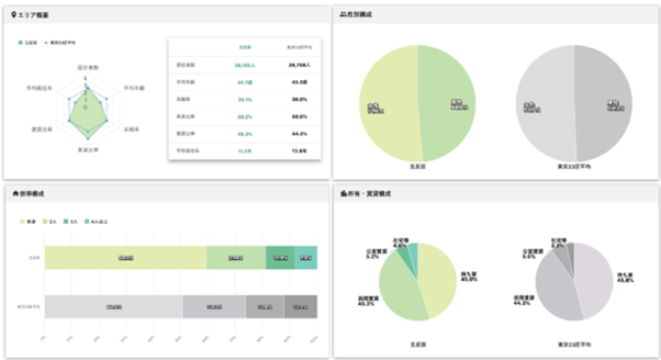 - 検索エリアの人口構成、世帯数、公共施設、商業施設などを表示します。