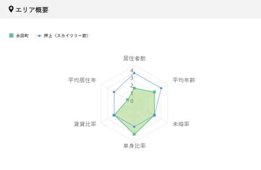 東京メトロ半蔵門線の永田町駅周辺と押上駅周辺を比較したのが以下の画面です。永田町駅周辺は居住人口が少ないことが特徴的です。また、単身比率が高く、平均居住年数が短いこともわかります。