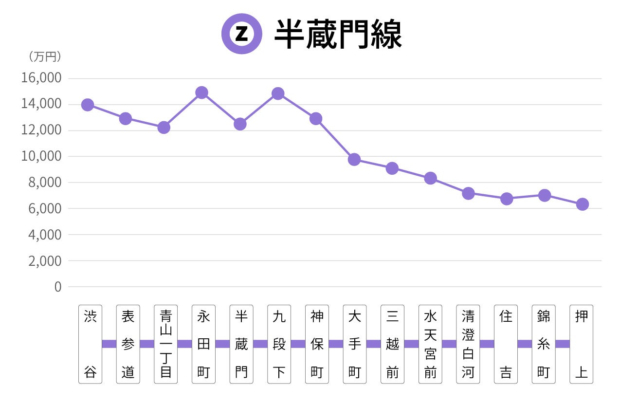 渋谷区から墨田区にかけて14駅を有するこの路線で、最も価格が高いのが永田町駅と九段下駅(いずれも千代田区)です。最も低いのが押上駅となっています。