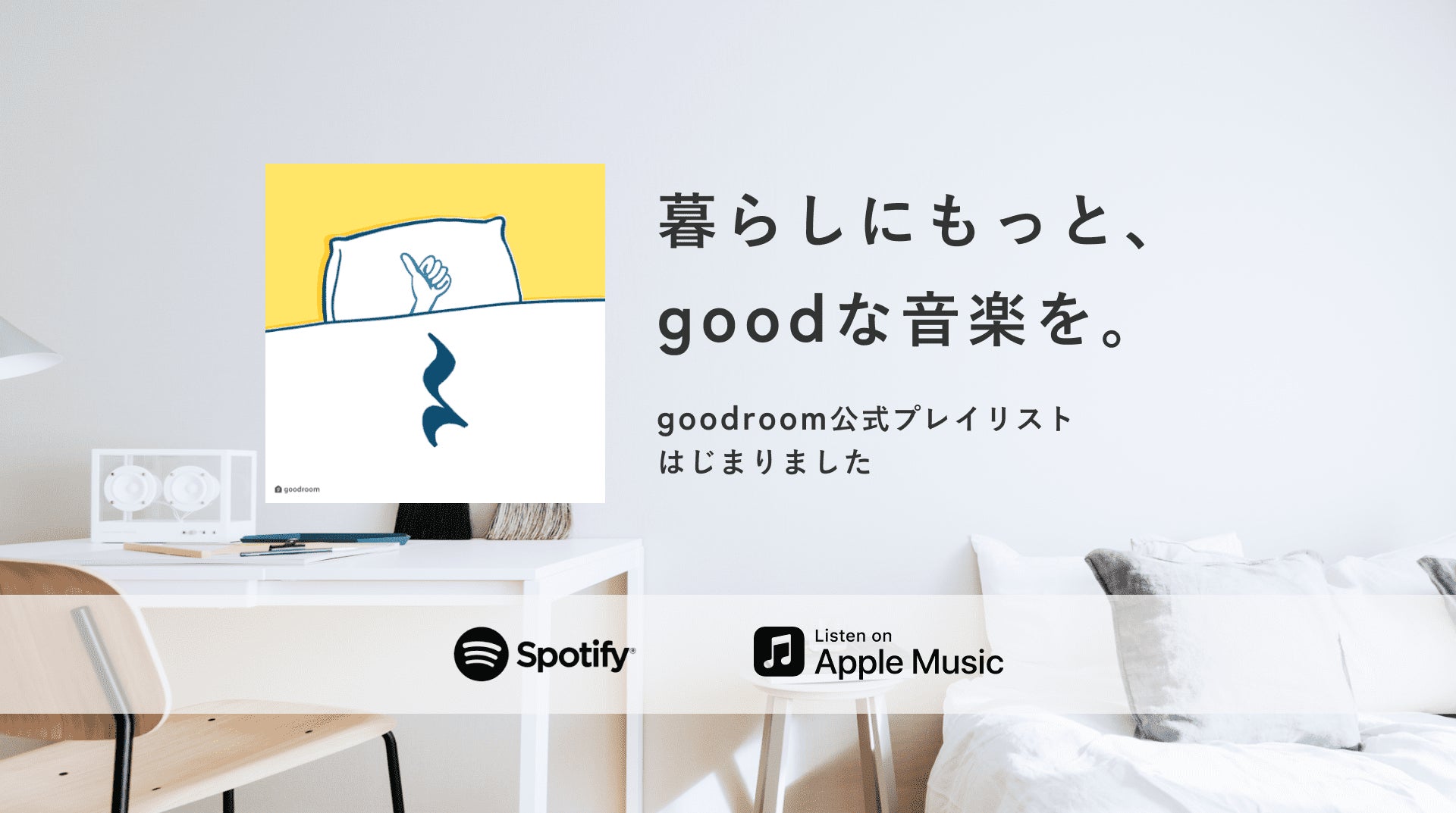 gooddays ホールディングス株式会社(代表取締役社長:小倉博)の子会社グッドルーム株式会社(代表取締役社長:小倉弘之、以下「goodroom」)は、当社初となるブランドプレイリストを公開いたします。生活提案企業として、賃貸やホテル・マンスリーでの暮らし方からインテリアや街歩きなどの暮らしをよくするコンテンツを提供してきたグッドルームが、今回は暮らしの様々なシーンで寄り添ってくれる「音楽」をお届けします。