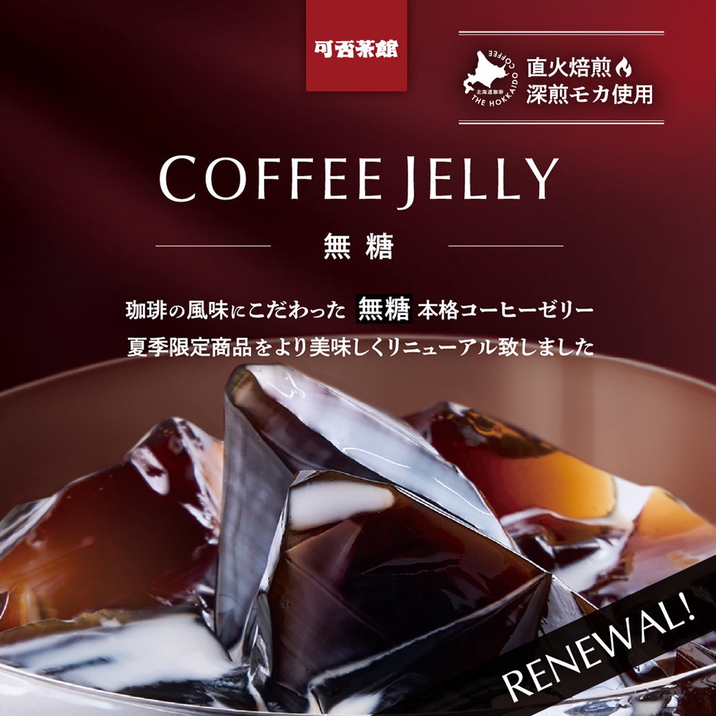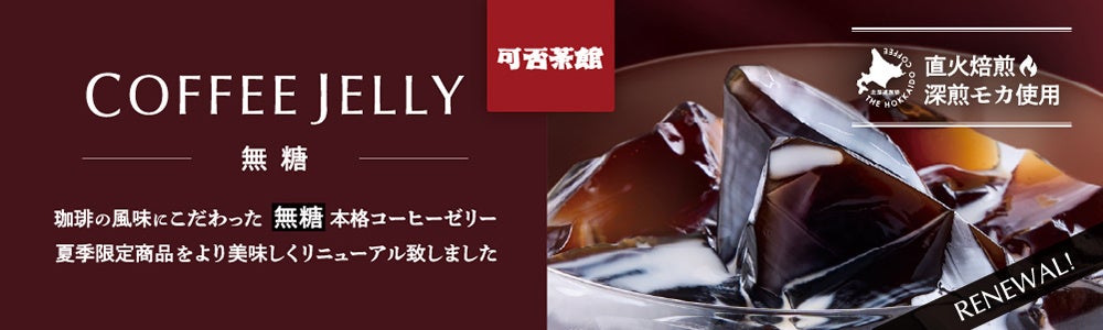 毎年夏季限定で販売していたコーヒーゼリーを、今年は珈琲の風味にさらにこだわってリニューアル。羊蹄のふきだし湧水を引き続き使用し、珈琲豆は直火焙煎で深煎りに焼き上げたモカを使用。無糖にすることで、可否茶館こだわりの深煎り珈琲の風味をより味わっていただけるよう仕上げました。付属のコーヒーフレッシュやガムシロップをかけると、深煎り珈琲の奥深い苦味にまろやかさをプラスしてお楽しみいただけます。