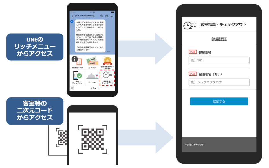 宿泊施設における大きな課題の一つである、チェックアウト時の混雑の解消の一助となるサービスとして、「客室精算・チェックアウト」を販売開始します。この機能では、客室等の二次元コードの読み取り、または宿泊施設のLINE公式アカウントからアクセスすることで、フロントに並ぶことなく、客室にてゲストの好きなタイミングに合せて宿泊費の精算・チェックアウトをすることができます。