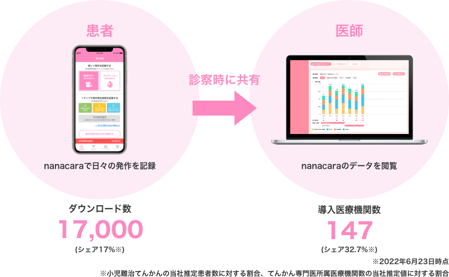 治験での協業と並行して両社は、てんかん発作に対して速やかな医療的支援の提供が可能な社会づくりを目指して、nanacaraを通じて蓄積されたてんかん発作等のリアルワールドデータ**を元にした研究を予定しています。