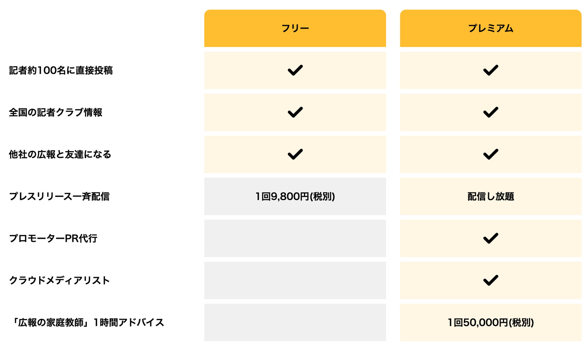 ・無料のフリー会員は、大手メディア所属のキーマンとなる記者100名に、プレスリリースをはじめとした自社のニュースを無料で何度でも情報提供が可能(フリー会員が、より多くのメディアへ配信したい場合、1回9,800円[税別]で約650メディアの中から300媒体ほどに一斉配信ができる。)