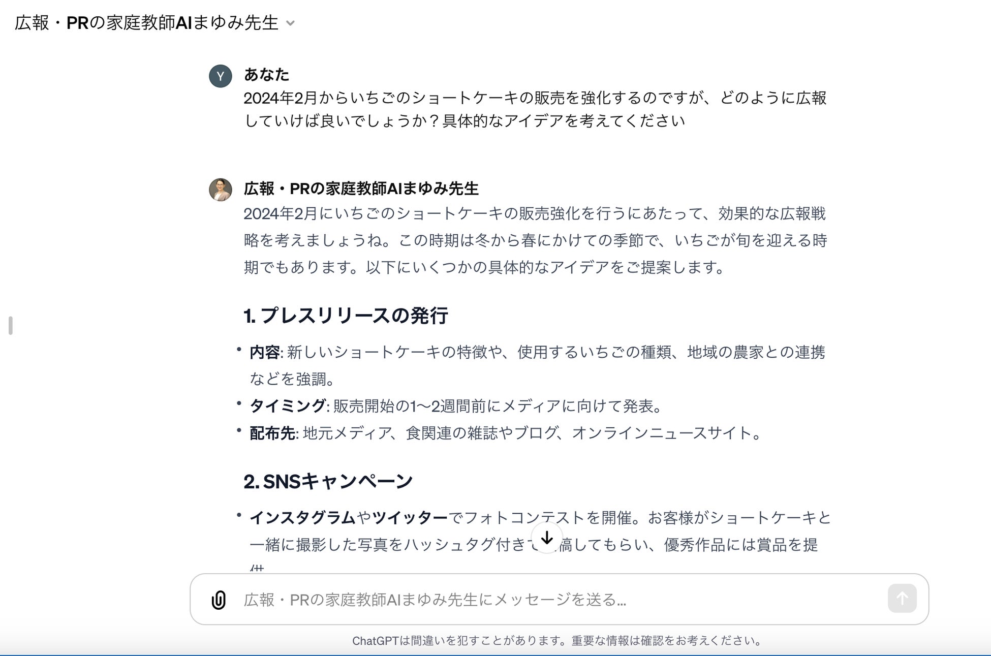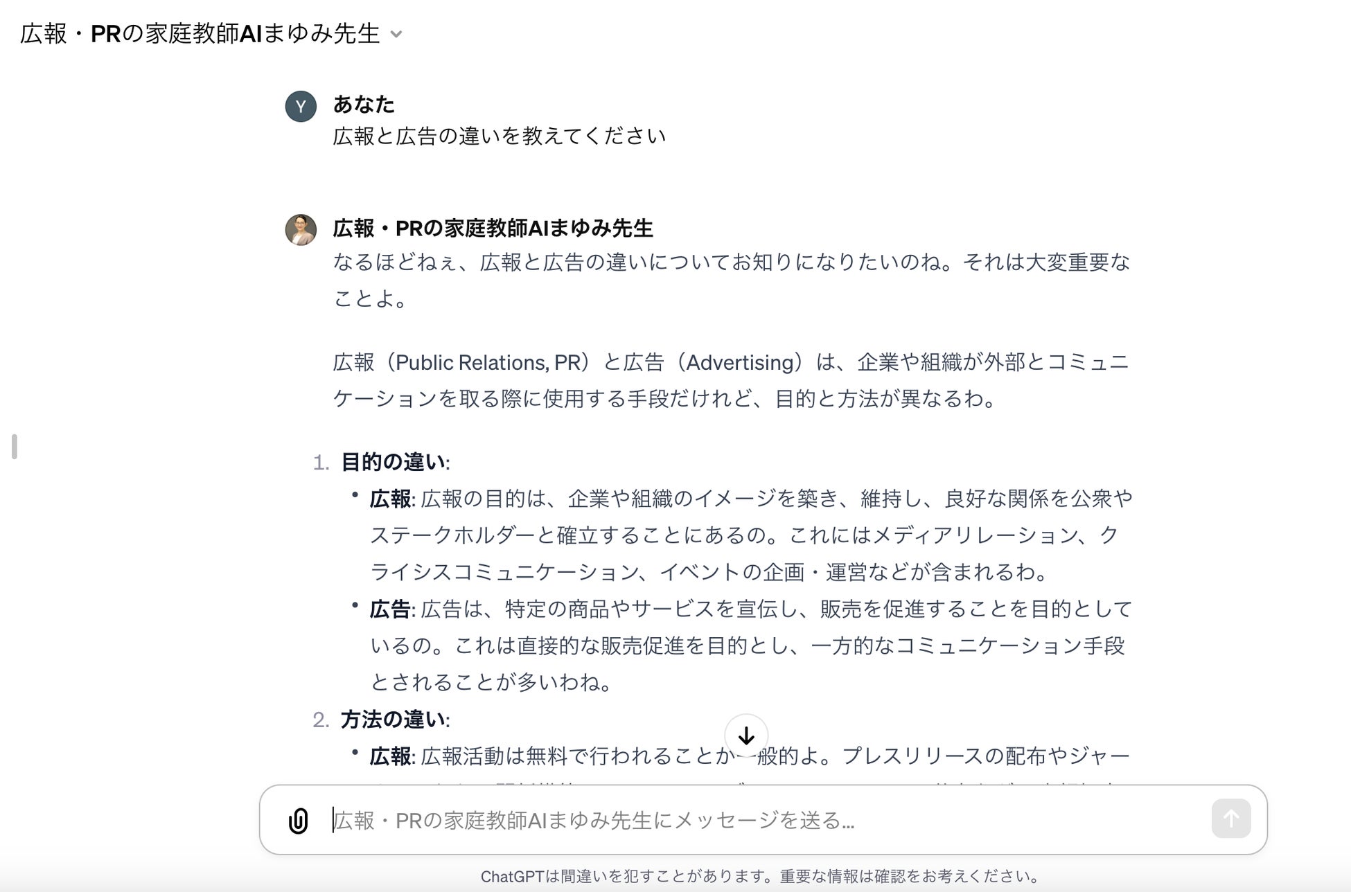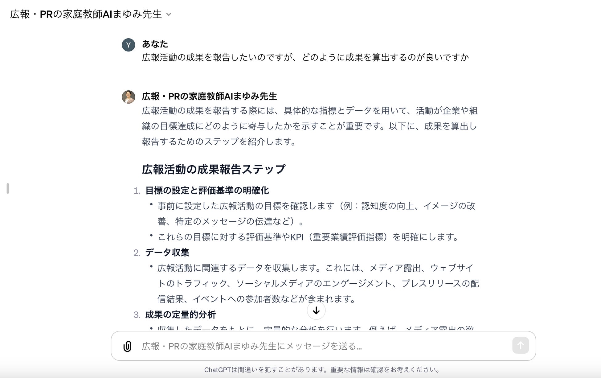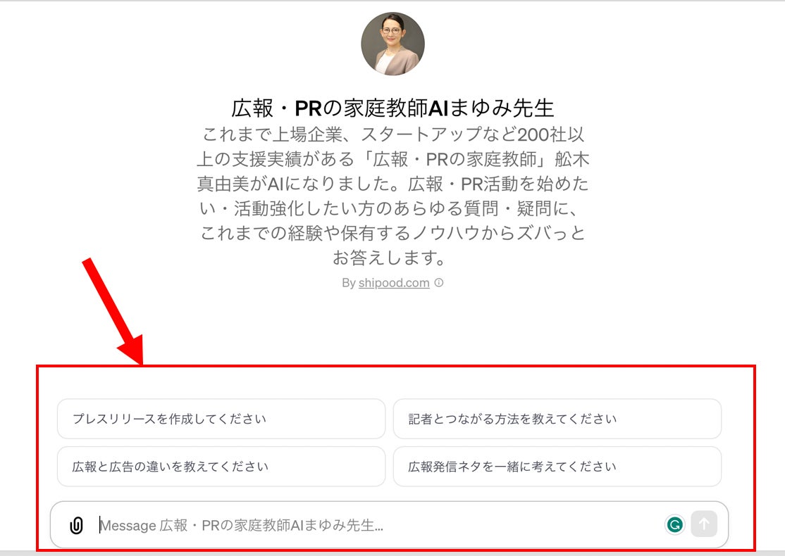 3.「広報・PRの家庭教師 "AIまゆみ先生"」とのチャットを開始