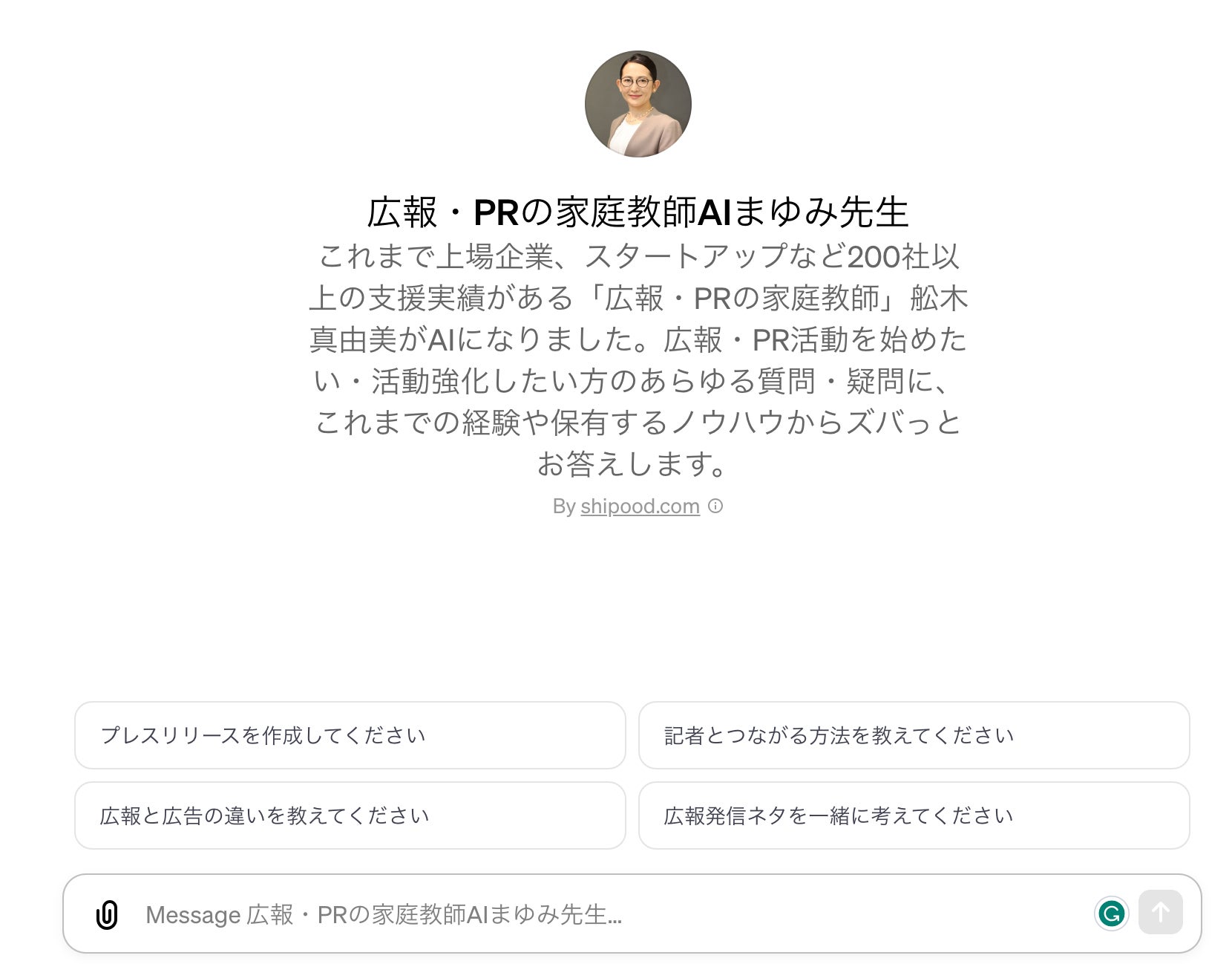 広報DXで「広報・PRの自動化」を実現し、企業の事業成長を支援するPRテック企業、株式会社シプード(本社:東京都中央区、代表取締役:舩木芳雄・舩木真由美、以下「当社」)は、この度、OpenAI社が提供するGPT Storeに広報PRノウハウを持つ「広報・PRの家庭教師 “AIまゆみ先生”」の提供を開始します。
