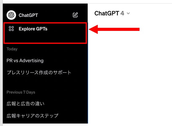 【参考】ChatGPTの画面の左上に「GPT Store」の入口があります。