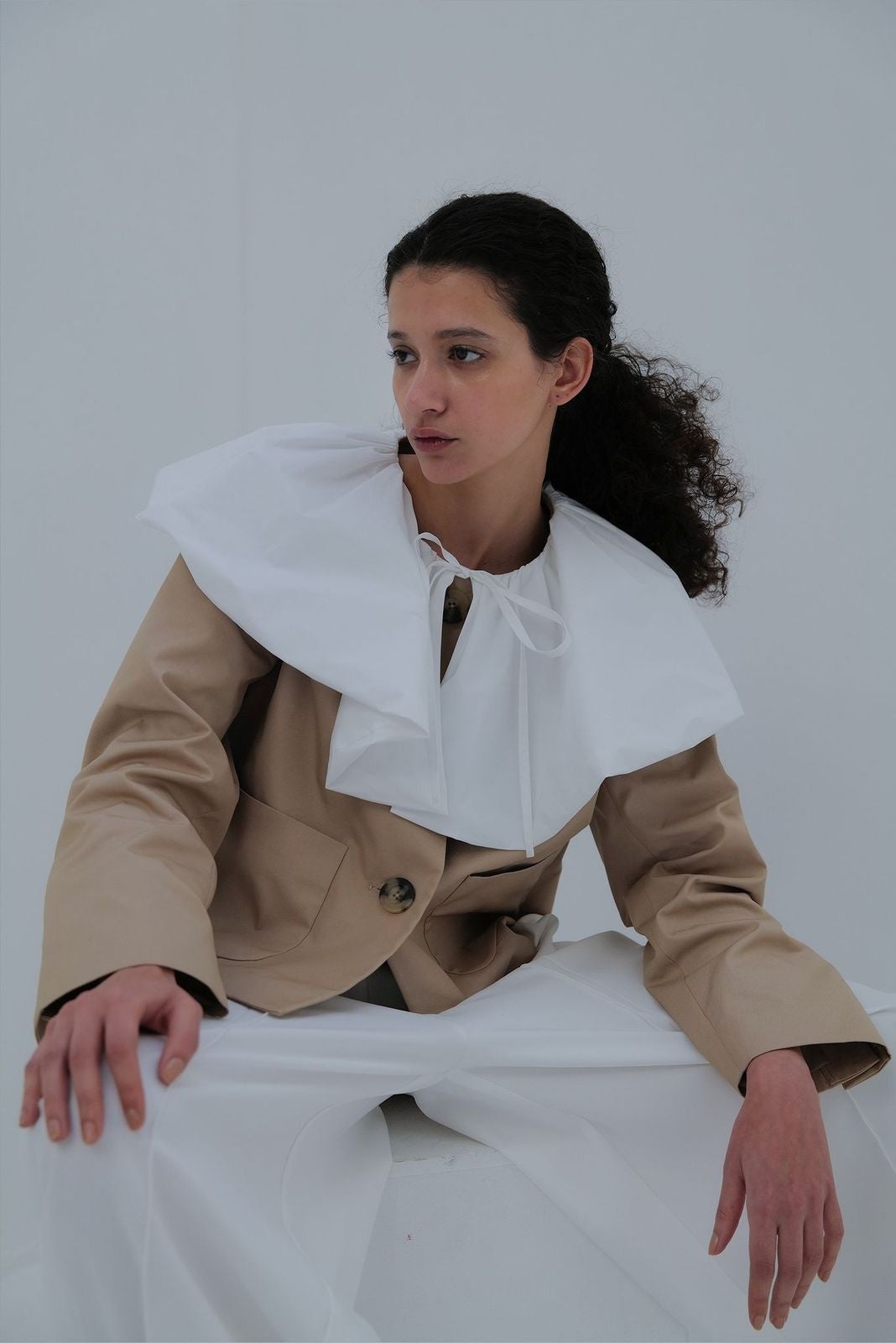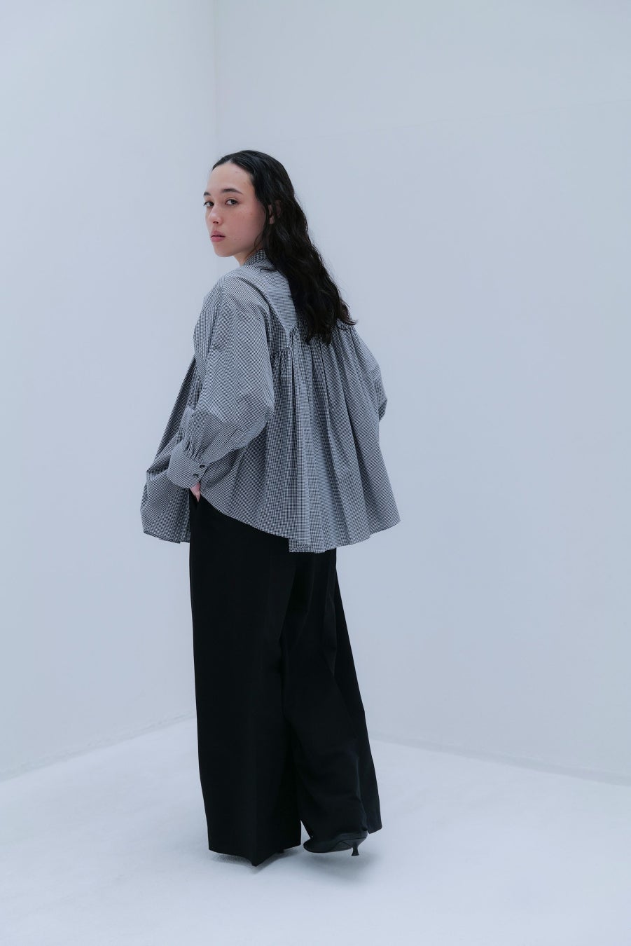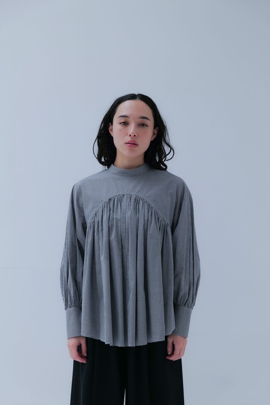 白鳥のシルエットからインスピレーションを受けた胸元のカーブデザインがポイントで、ギャザーをたっぷり入れた構築的なシルエット。ヒップが隠れる着丈で、気になる部分の体型をカバーしながら、モードに着こなせる1枚です。