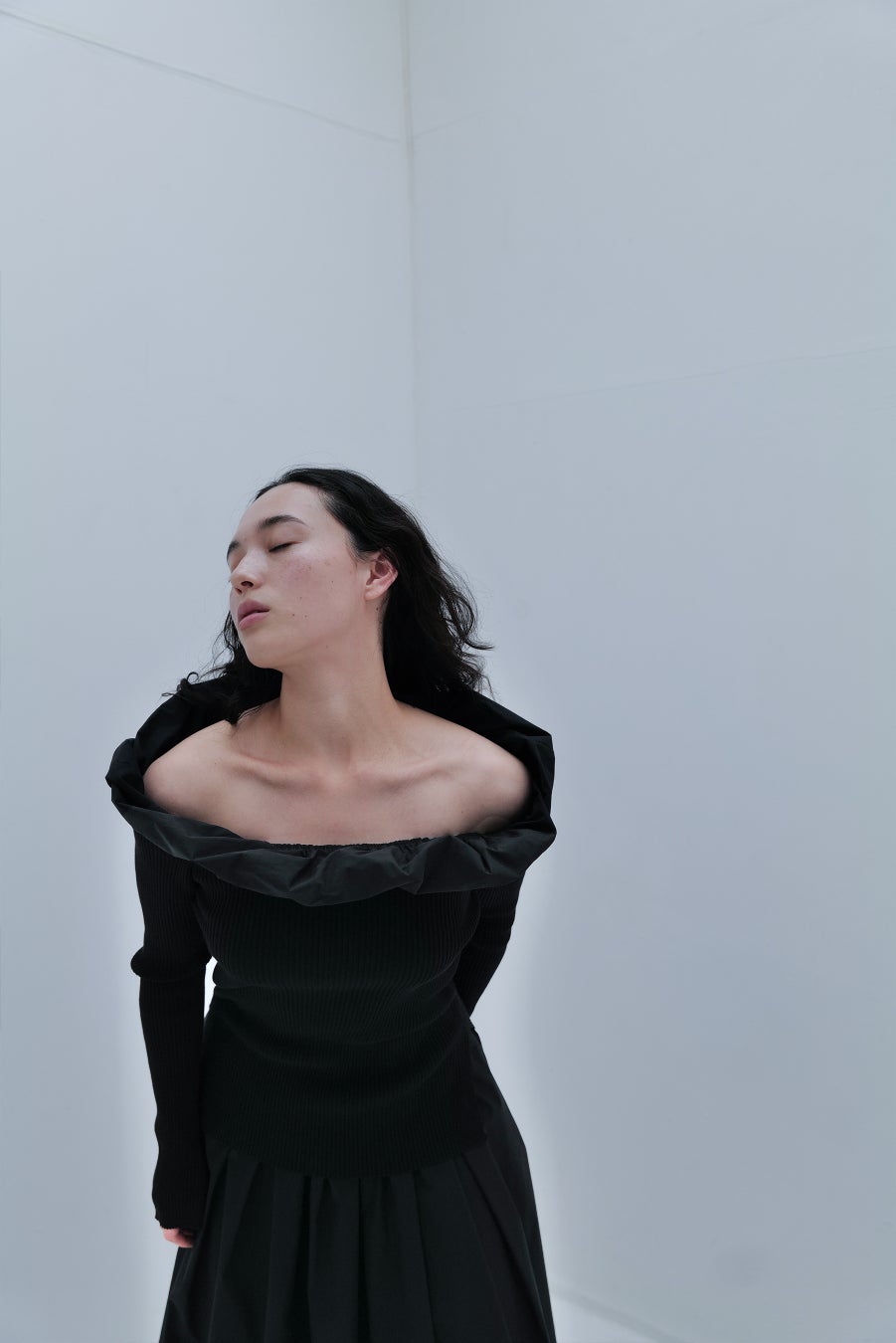 オフショルダーで着用いただく際は、バルーン部分を立たせるとモード感が出て、こなれた印象に。