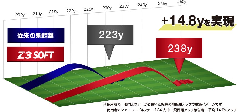 Z3 SOFT使用者124名を対象にしたアンケートでは、ボールを変えただけで平均14.8yもの飛距離アップ報告がありました。