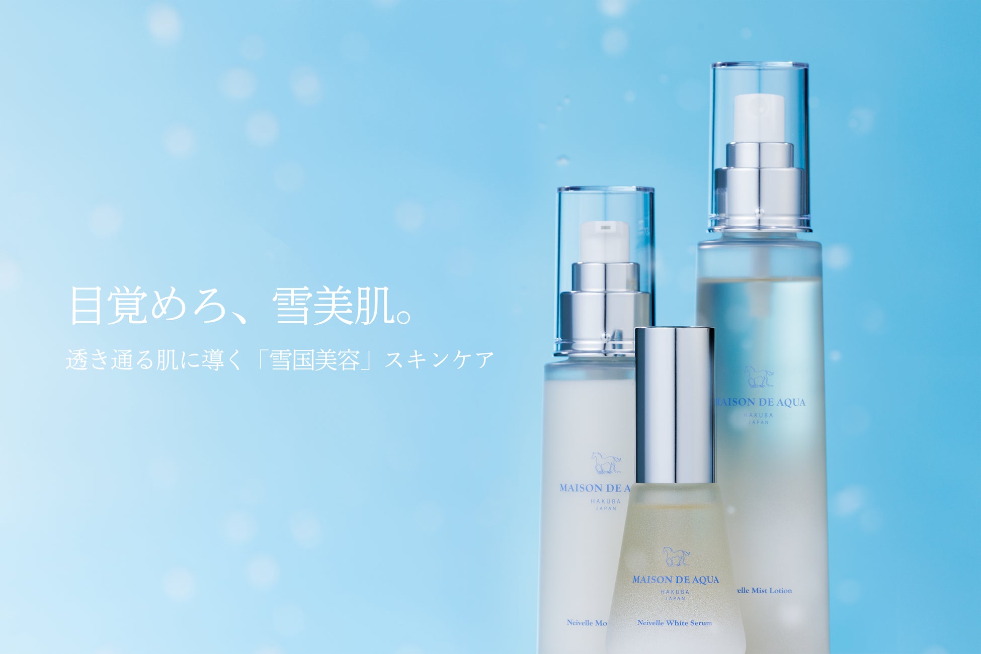 「雪美肌(ゆきみはだ)」は、過酷な環境下で育つ雪国の植物の生命力とメゾン・ド・アクアが追求する「水の潤い」を表現したキャッチコピーとなっており、雪国で暮らす女性の肌のように強く透明感※1のある肌へ導くスキンケアを表現しています。