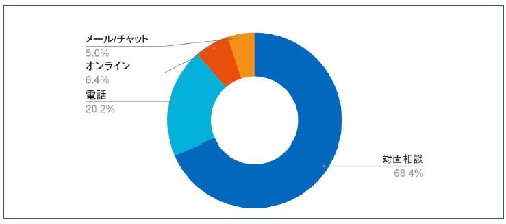 初回相談の形式は、「対面相談」68.4%が最多ですが、「電話相談」20.2%、「オンライン」6.4%と続きます。対面が主流である一方、非対面型相談など多様な相談スタイルが浸透しつつあり、特に若年層ではオンラインの利用が進むなど、利便性を重視する層がいることが確認できました。