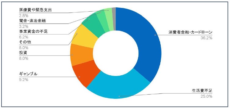 債務整理に至った主な原因は、「消費者金融・カードローン」36.2%、「生活費不足」25%で、パチンコ、競馬など「ギャンブル」9.2%、株式、FX、暗号資産などの「投資」8%。「親族の借金を肩代わり」「生活費が不足し借入を繰り返した」「事業資金のためやむなく借金」といった声もあり、日常生活の困窮に加え、投機的な行動や家族関係、事業資金など、債務整理に至るさまざまな背景が示されました。
