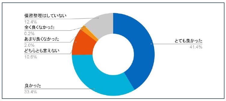債務整理の評価は、「とても良かった」41.4%、「良かった」33.4%で計74.8%が肯定的な評価を示し、満足度の高さがうかがえます。