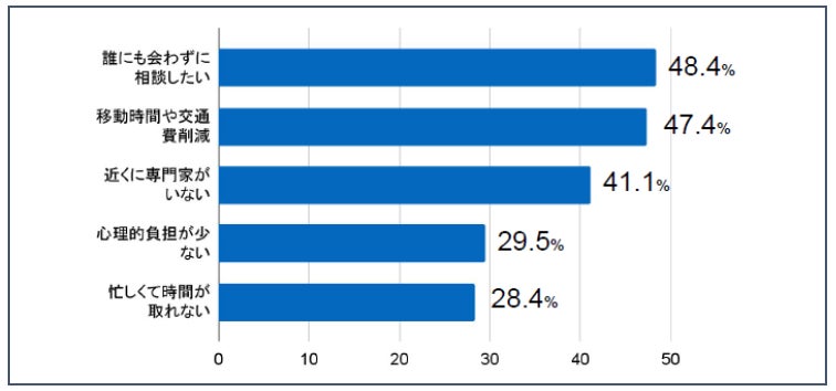 専門家との面談形式の希望を聞くと、「対面面談」70%が最多で、続いて「オンライン面談」が19%(95人)になりました。オンライン面談を希望する人に理由をたずねたところ「誰にも会わずに相談したい」48.4%、「移動や交通費を削減したい」47.4%、「近くに専門家がいない」41.1%が主な理由にあげられました。女性では「周囲に知られにくい」との理由も多く、自由回答では「子供がいて外出できない」「人目が気になるのでオンラインを希望」といった意見がありました。