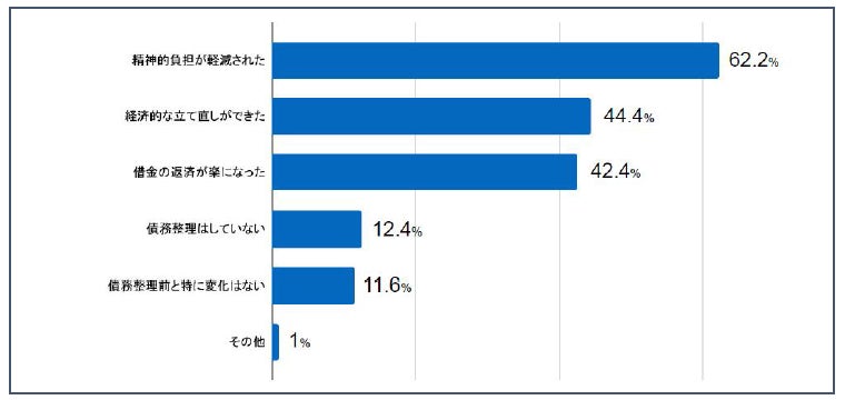 債務整理後の生活変化については、「精神的負担が軽減された」62.2%、「経済的な立て直しができた」44.4%、「借金の返済が楽になった」42.4%などと経済的、精神的な負担の減少が読み取れ、家計管理のしやすさや日常の不安の軽減など、生活再建につながる変化が広く表れています。
