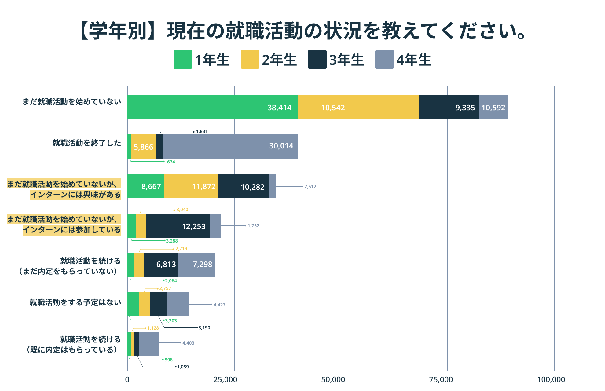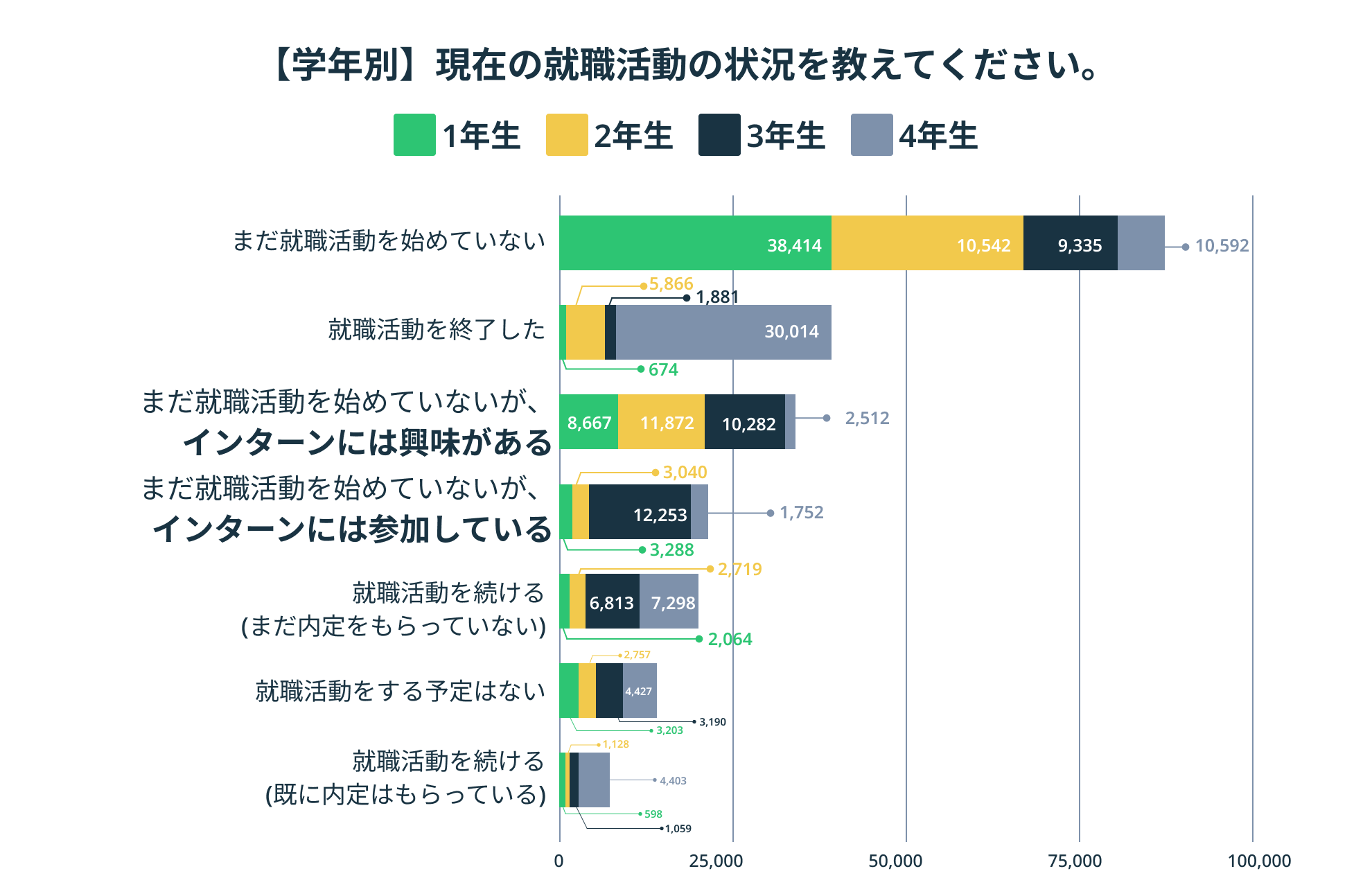 現在の就職活動の状況は、全体で見ると「就職活動を終了した(17.9%)」「まだ就職活動を始めていないが、インターンには興味がある(14.7%)」、「まだ就職活動を始めていないが、インターンには参加している(9.1%)」という結果となった。「インターンシップに参加もしくは興味がある」と回答した学生のうち、1年生は「21.0%」、2年生は「26.3%」という結果に。1・2年生の約4人に1人が「インターンシップに参加もしくは興味がある」と回答し、1・2年生の1.78%が「就職活動を続ける(既に内定はもらっている)」と回答していることから、本格的に就職活動が開始する大学3年生より以前から就職を意識して学生生活を送っている様子が見られた。