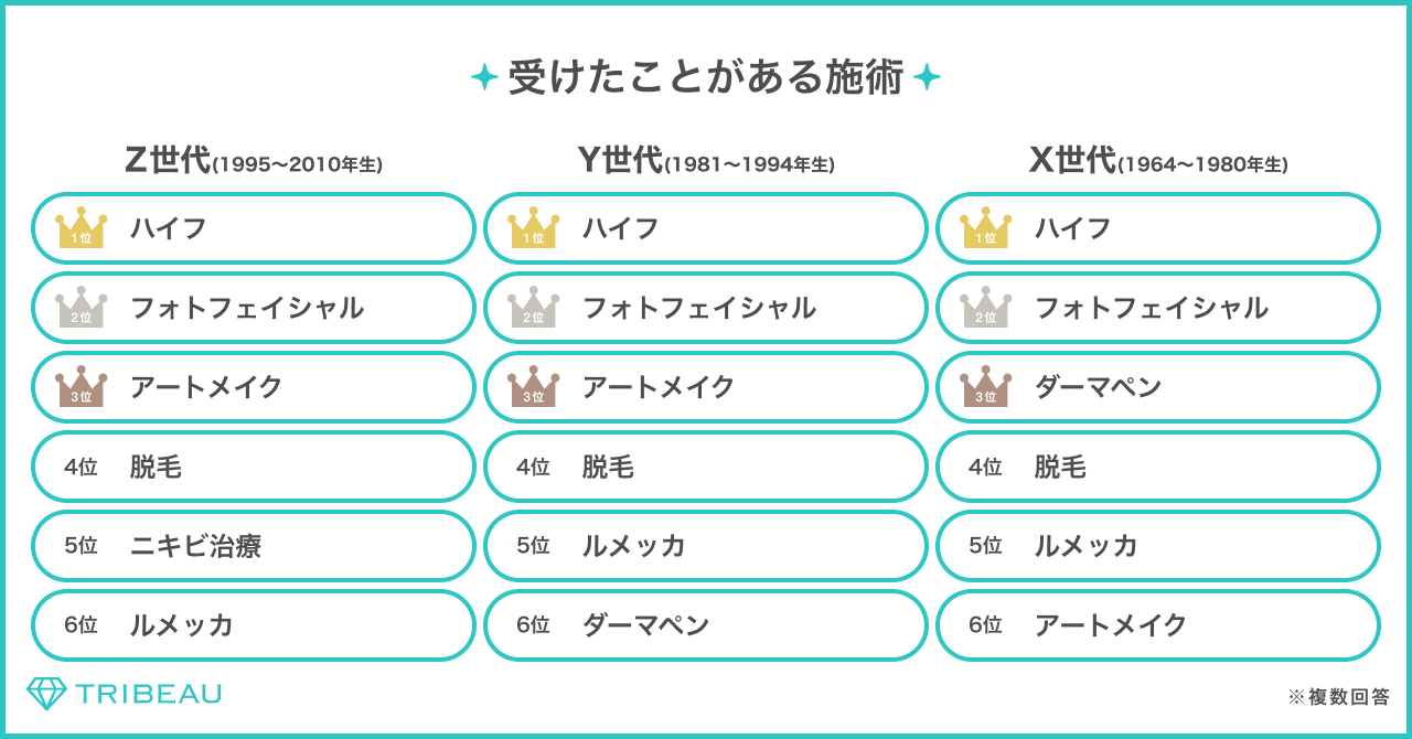 経験施術を聞いたところ、全世代「ハイフ」が1番多く、次いで「フォトフェイシャル」となった。順位は多少異なるが、どの世代も肌管理系の施術が多い結果となった。