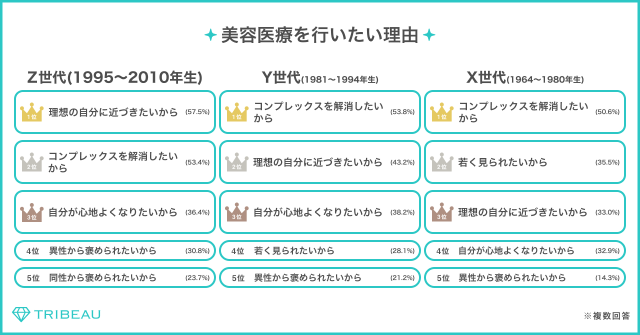 美容医療を行いたい理由を聞いたところ、Z世代は「理想の自分に近づきたいから」(57.5%)次いで「コンプレックスを解消したいから」(53.4%)「自分が心地よくなりたいから」(36.4%)に対して、X世代においては「若く見られたいから」(35.5%)が2位にランクインし、アンチエイジング目的で美容医療を行いたいことが分かった。また、Z世代は異性からの褒めだけでなく「同性から褒められたいから」(23.7%)がランクインし、SNSで自身を発信する機会があることにより、性別関係なく他者からの評価を意識していることが読み取れる。