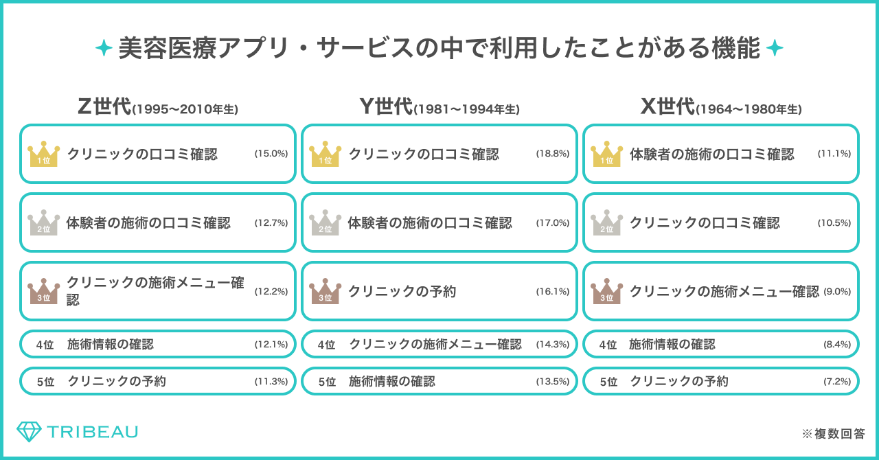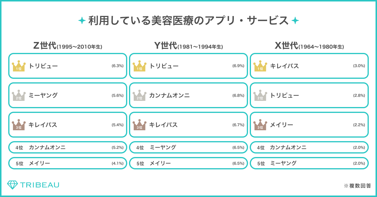 ・利用している美容医療のアプリ・サービスを聞いたところ、Z世代・Y世代には「トリビュー」が一番利用されている結果となっている。
