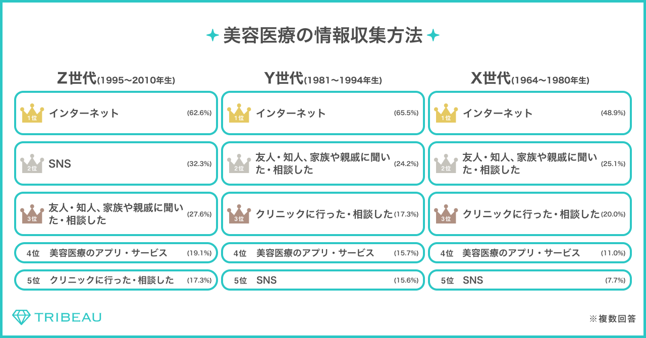 美容医療の情報収集経路を聞いたところ、「インターネット(ブラウザでの検索)」が全世代で1番多い結果となった。次いでZ世代は「SNS」(32.3%)が多い一方で、Y世代、X世代においては「SNS」は最下位となった。ソーシャルネイティブのZ世代は情報収集経路としてSNSを活用していることが分かった。