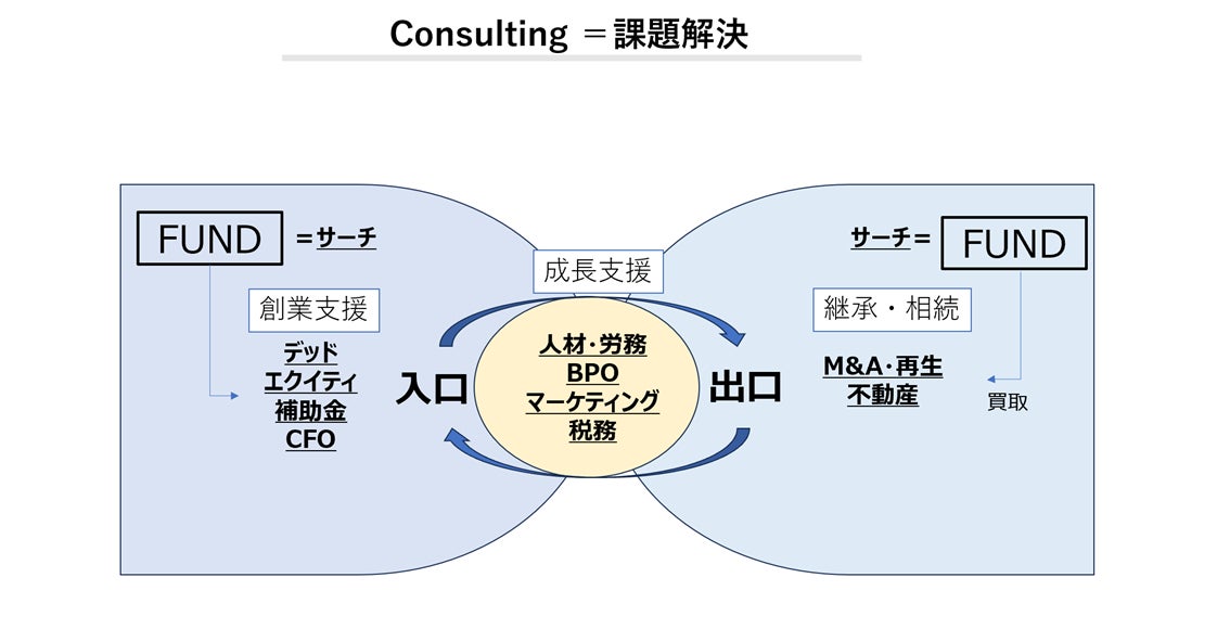 SAKURA U.S. コンサルティングの特徴は、「創業・起業時(入口)」と「事業承継時(出口)」の両サイドの支援、さらに入口と出口の間にある「成長支援」までを一気通貫で行うことです。会社の一生涯を、世代を超えて伴走いたします。また、以下のような弊グループがこれまで培ってきたノウハウや経験、ネットワークを投入してまいります。