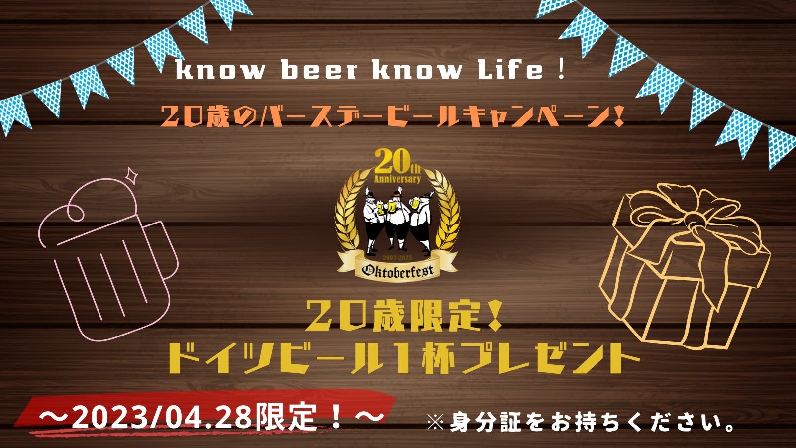 2023年4月28日(金)当日に満20歳の方(2002年生まれ4月1日~2003年4月28日生まれの方)限定で、バースデービール(500ml)をプレゼント!