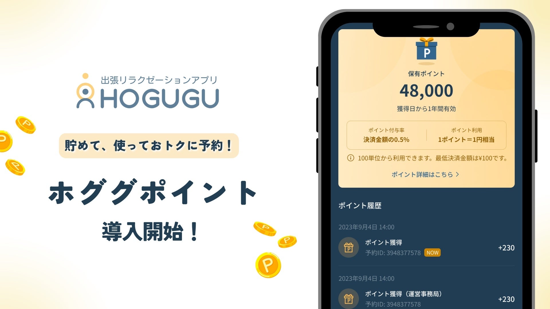 株式会社HOGUGUテクノロジーズ(代表取締役:花岡賢一、以下、HOGUGU社)が提供する出張リラクゼーションアプリ「HOGUGU(以下、「ホググ」)」はこの度、新たにポイントシステム「ホググポイント」を導入しました。