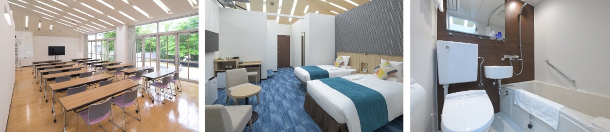 本アカデミーは、独自のプログラムを実現するため、ホテルの洋室、和室を再現したモックアップルームを完備しています。また、冷暖房・ミニ冷蔵庫・トイレ・バス・Wi-Fi完備のお部屋は1人1部屋の個室利用のため衛生的で安心です。その他施設内にはランドリールーム、庭園には実習生同士のコミュニケーションを深めることができるBBQテラスを備え、実習生が長期滞在でもプライバシーを守りながら快適に学習に集中できる環境が整っています。