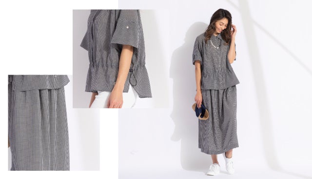 カジュアルになりがちなチェックも落ち着いた色味なら大人にも着こなしやすく、こなれ感のある着こなしに。柔らかでドライな質感のシャドーチェックはブラウス・スカートのセットで着られます。あえてスニーカーと合わせたクリーンで女性らしいスタイルが新鮮!