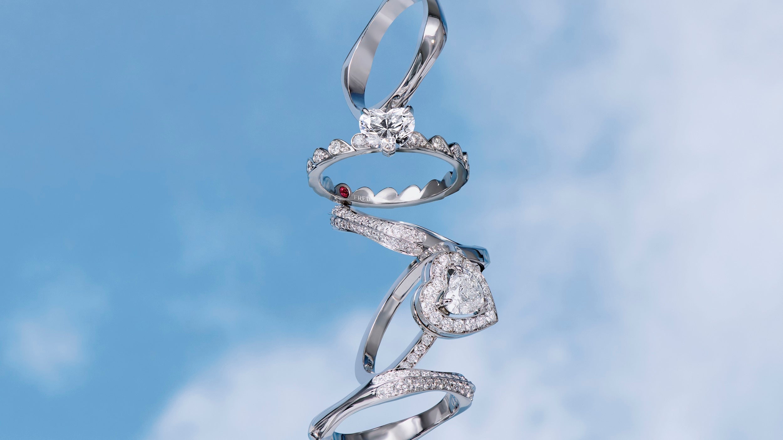 プリティウーマン コレクションには、ハートカットダイヤのソリティアがエレガントかつフェミニンな大輪の花のようにまばゆい輝きを放つエンゲージメントリングが加わり、コレクションをさらに充実させました。ハート イン ハートのシグネチャーでもあるこのリングの裏側には、情熱的なレッドルビーがベゼルセッティングでセットされ、二人だけが共有するこの赤は、まさにフレッドが祝福する愛を意味しています。