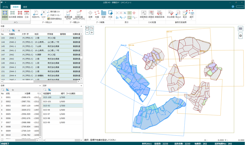 地籍計算CADデータの背景表示(レイヤ)に対応。複数の成果データを参照モードで背景表示。