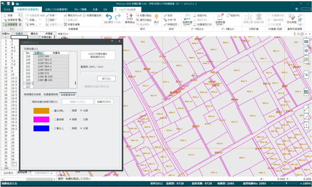 充実した地番の検査機能。地番結線の重複、隣接する構成点、地番重複の検査を装備。