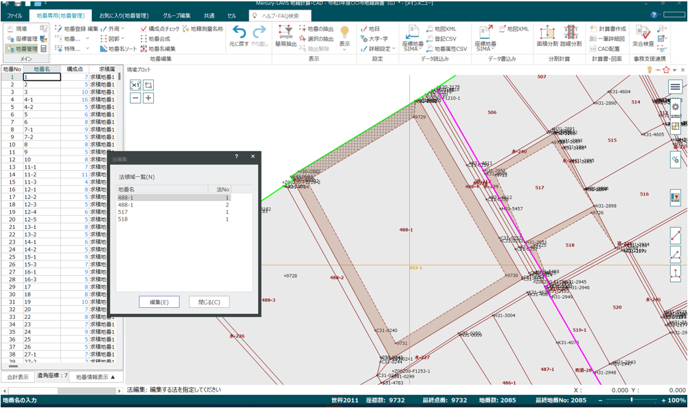 「Mercury-LAVIS」は、法務局データから貸与される要約書 CSV(登記)を利用して、地籍調査および法14条地図整備におけるD工程〜H工程まで一連の業務を支援するシステムです。