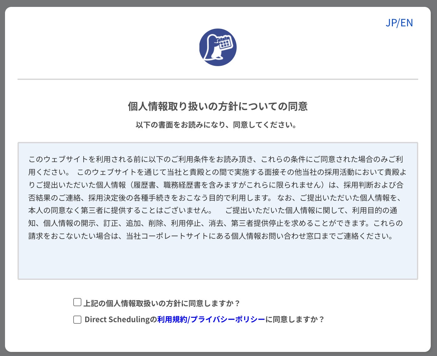 Direct Schedulingでは、日程調整の段階で個人情報取得方針同意文に同意していただくことが可能です。(文章の独自カスタマイズも可能)