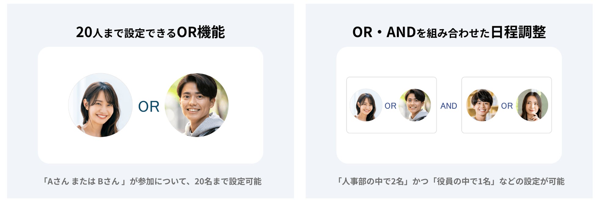 面接官と予約者の1:1の日程調整だけではなく、全員参加、複数人の中で1人が参加、その組み合わせなど複雑な日程調整を自動化できます。