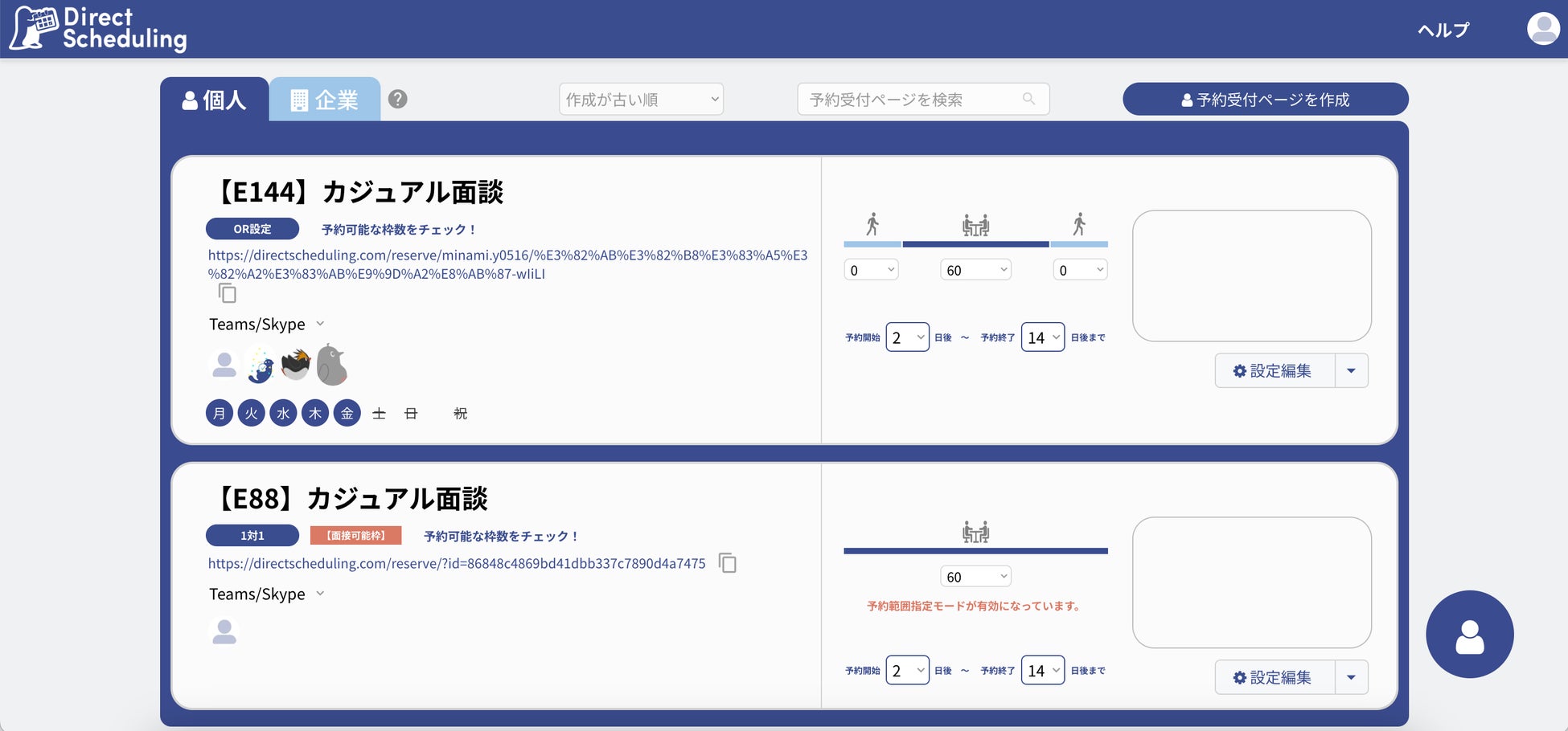 画面がシンプルなのでURLの作成時に、操作に迷いません。他社ツールではトップページ全体に様々なパターンの設定機能が羅列されており、動線が細分化されています。そのため、操作を覚えるまでに時間がかかってしまいますが、Direct Schedulingでは「予約受付ページを作成する」ボタンから全て完結できるため迷いません。