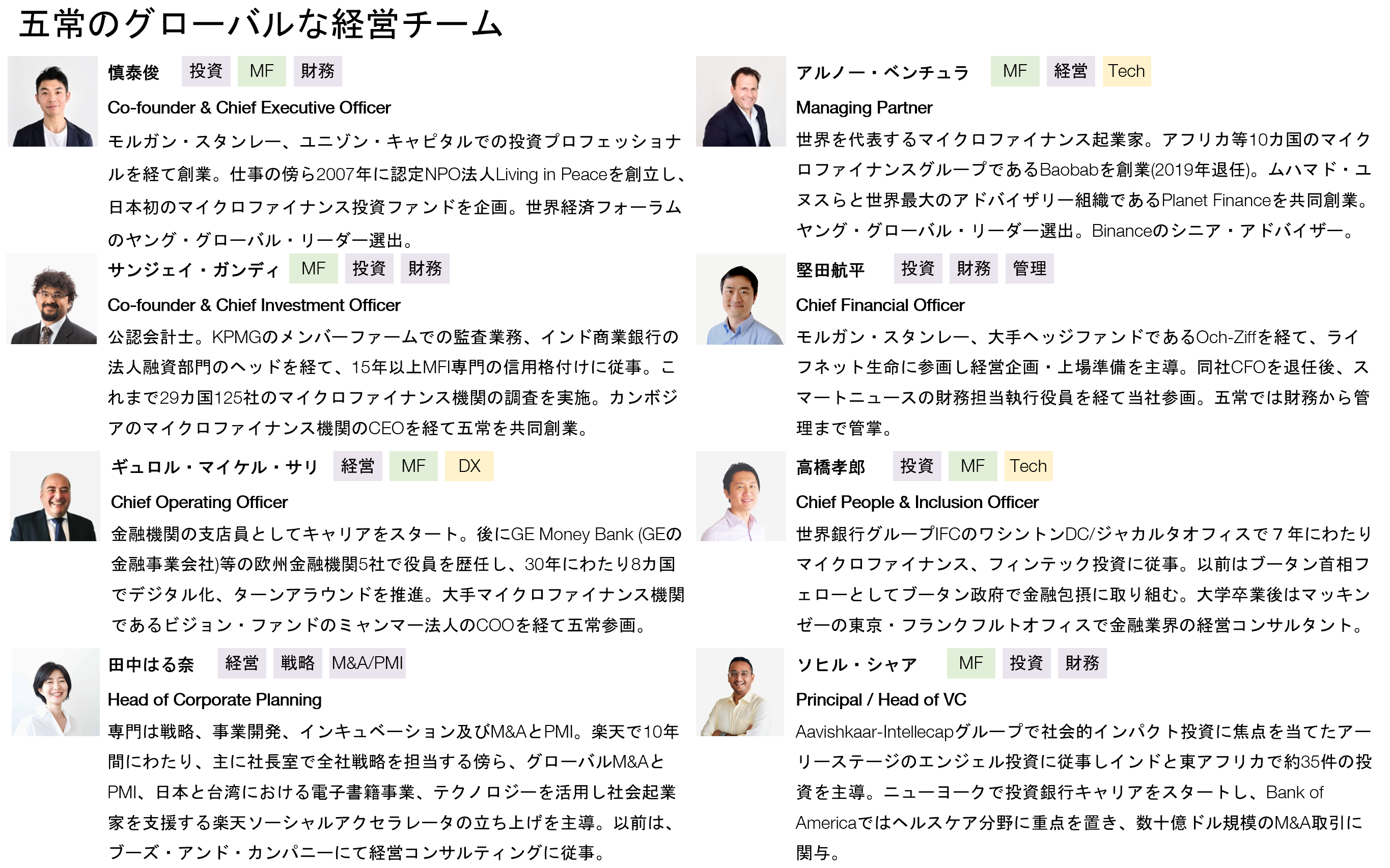 そして、このようなガバナンスを徹底できる土台には、当社チームの業界知見があります。五常の経営チームには世界中でマイクロファイナンスに関わってきたものが多く、実務知識、事業の目利き力、世界中の事業者・投資家とのネットワークを有しています。こうした業界知見がグループ会社に対する実効性のあるガバナンスの遂行を可能にするとともに、新規展開国での再現性の高い事業立ち上げ・M&Aの実行を可能にしています。