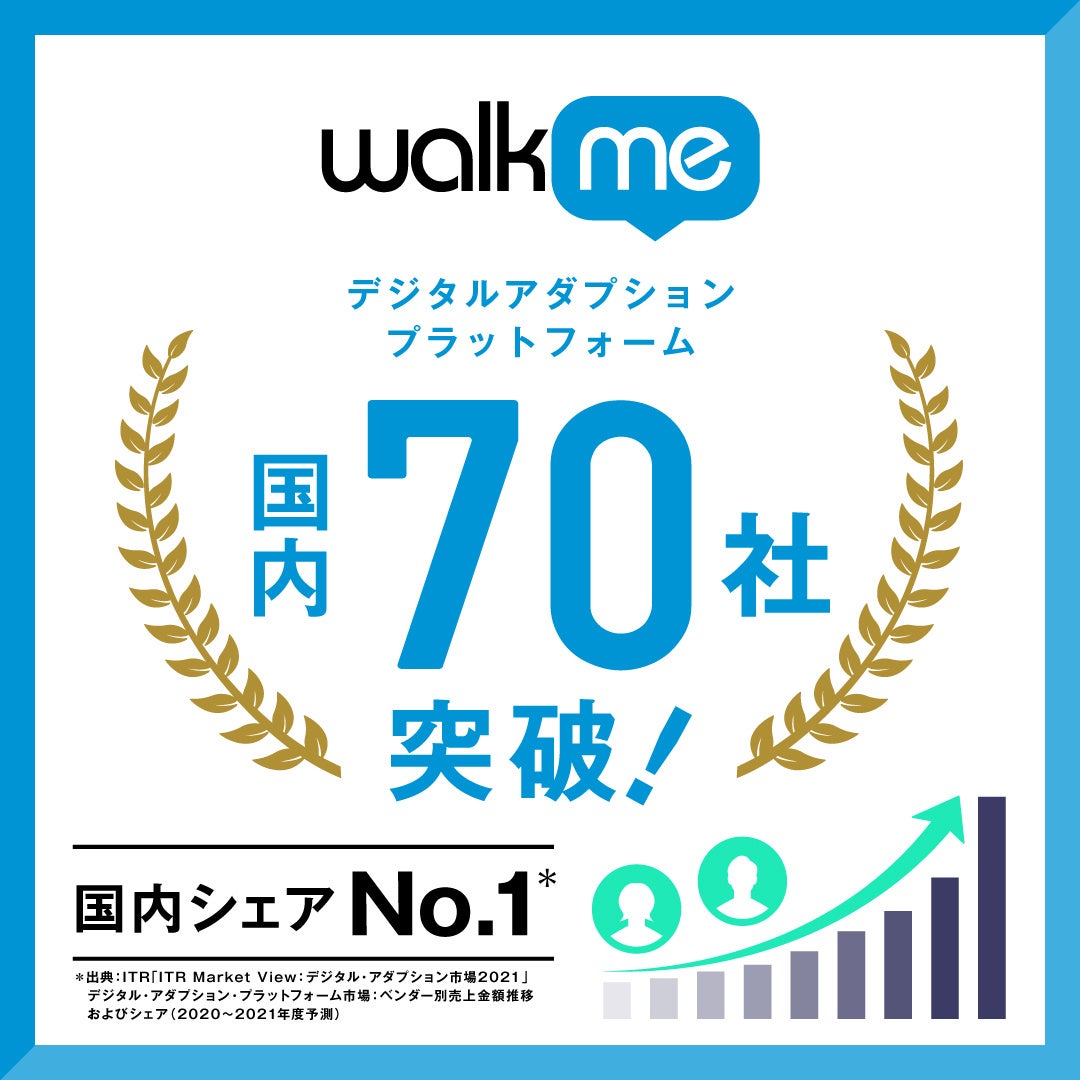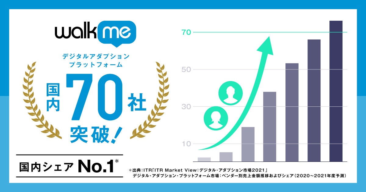 デジタル・アダプション・プラットフォームのリーディングカンパニーであるWalkMe株式会社(代表取締役 アルナ・バスナヤケ 、東京都港区、以下WalkMe)は、2022年6月で日本でのビジネス開始より3周年を迎えました。加えて、デジタル・アダプション・プラットフォーム「WalkMe」(以下、WalkMe)の国内導入企業数が70社を超えたことをお知らせします。また、株式会社アイ・ティ・アール(以下、ITR)が発行する市場調査レポート「ITR Market View:デジタル・アダプション・プラットフォーム市場:ベンダー別売上金額推移およびシェア(2020〜2021年度予測)」において、国内売上シェアNo.1を獲得いたしました。