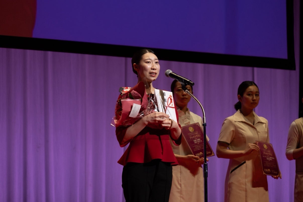 グランプリを獲得した堀間詩捺は、受賞スピーチでアンジェラックスの仲間や応援してくださった皆さま、そして大切なお客様への感謝の言葉を述べるとともに、「人生が変わるほどの力を持つエステティックという仕事」への誇りを力強く語りました。