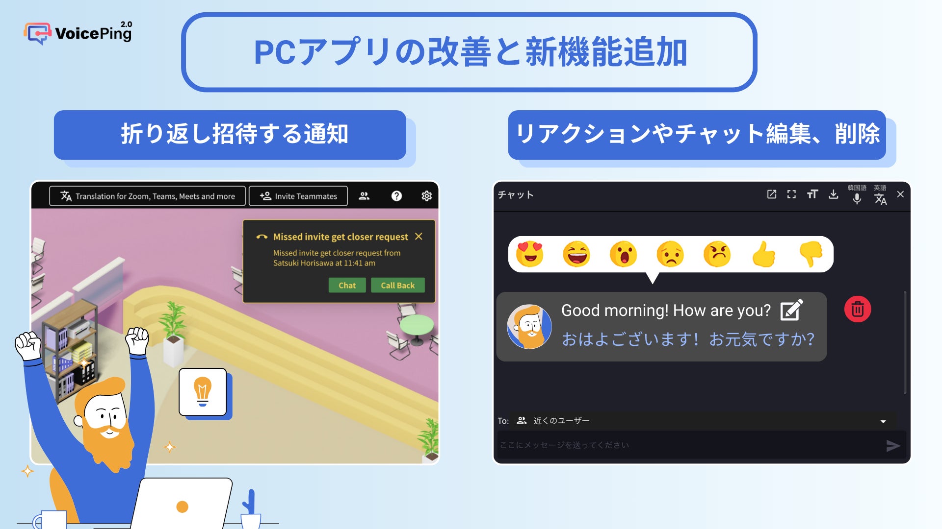 お客様の体験をより一層高めるため、VoicePingの大規模なプロダクトアップデートを実施いたしました。新たなフロア背景を追加し、仮想オフィス環境をより楽しくしました。さらに、ホワイトボード機能を大幅に改善し、図形挿入やペンサイズ等の操作性が向上しました。また、Zoom、Teams、Google Meetなどのミーティングツールを使用する際のリアルタイム音声翻訳と議事録機能追加により、グローバルビジネスで本格的に活用いただけます。