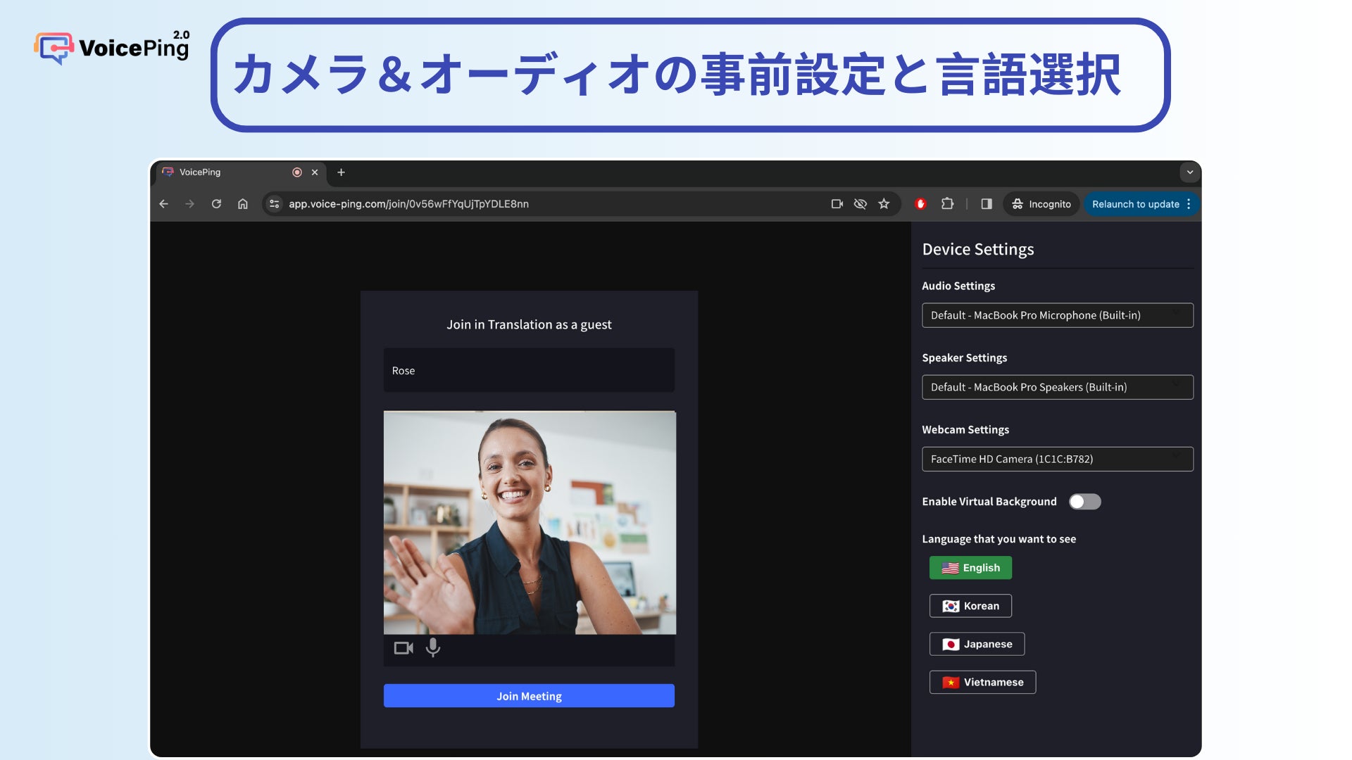 さらに、ゲストユーザーの便利性も向上しました。ブラウザからVoicePingの会議に参加する前に使用言語の選択が可能になり、ウェブアプリからミーティングから参加する場合もゲストは事前にオーディオやウェブカメラの設定を行うことができます。
